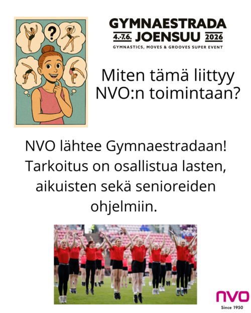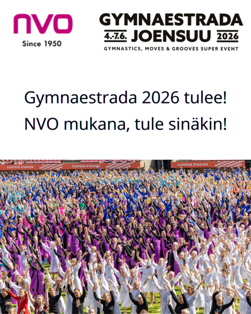 Muista liittyä NVO:n Gymnaestradan whatsapp-yhteisöön, jos yhtään tuntuu, että voisit itse tai esim. kotoa löytyvä jumppari voisi olla kiinnostunut lähtemään tapahtumaan ensi kesäkuussa! Tiedottamisen seuraaminen ei sido mihinkään.