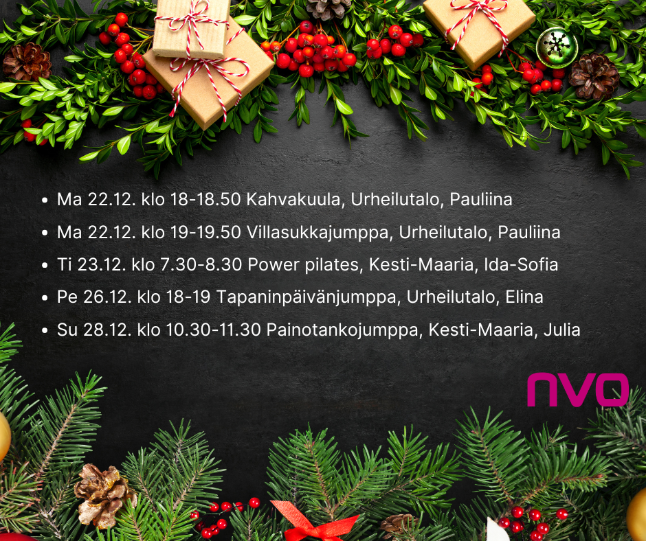 Tarjolla on mm. kahvakuulaa, villasukkatreeniä, pilatesta, kehonhuoltoa, toiminnallista harjoittelua ja Tapaninpäivänjumppa – jokaiselle jotakin! ❤️