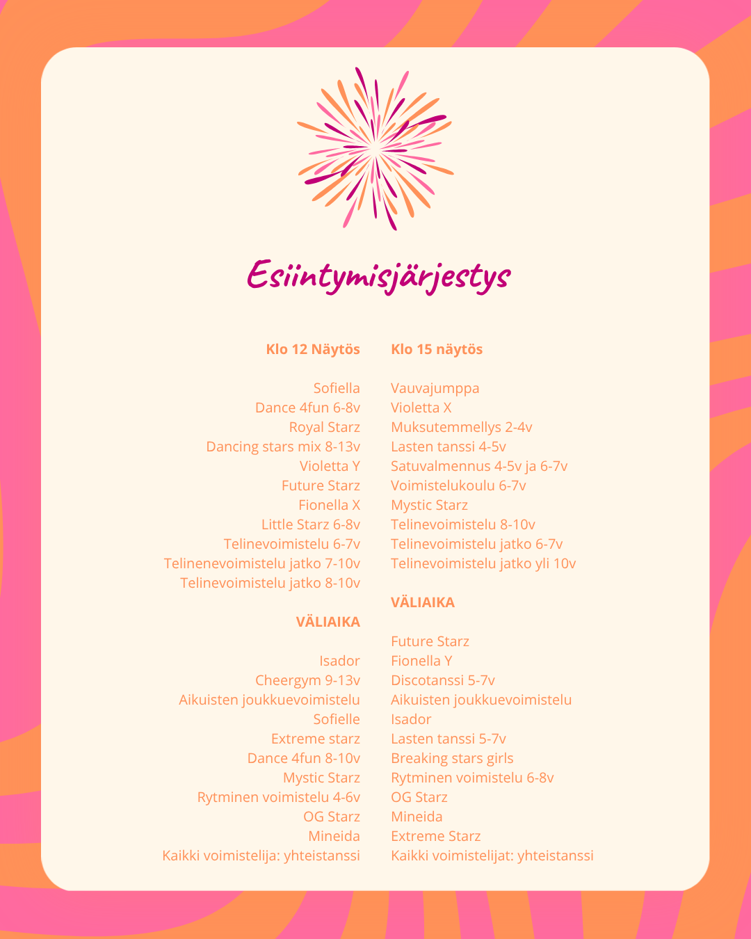 Ohessa molempien näytösten esiintymisjärjestys, jotta on helpompi seurata ohjelmaa ja suunnitella päivän kulkua. Kuitenkin näytöksessä esiintyy kymmeniä jumppareita, joten varaamme oikeuden mahdollisesti ilmaantuviin muutoksiin.