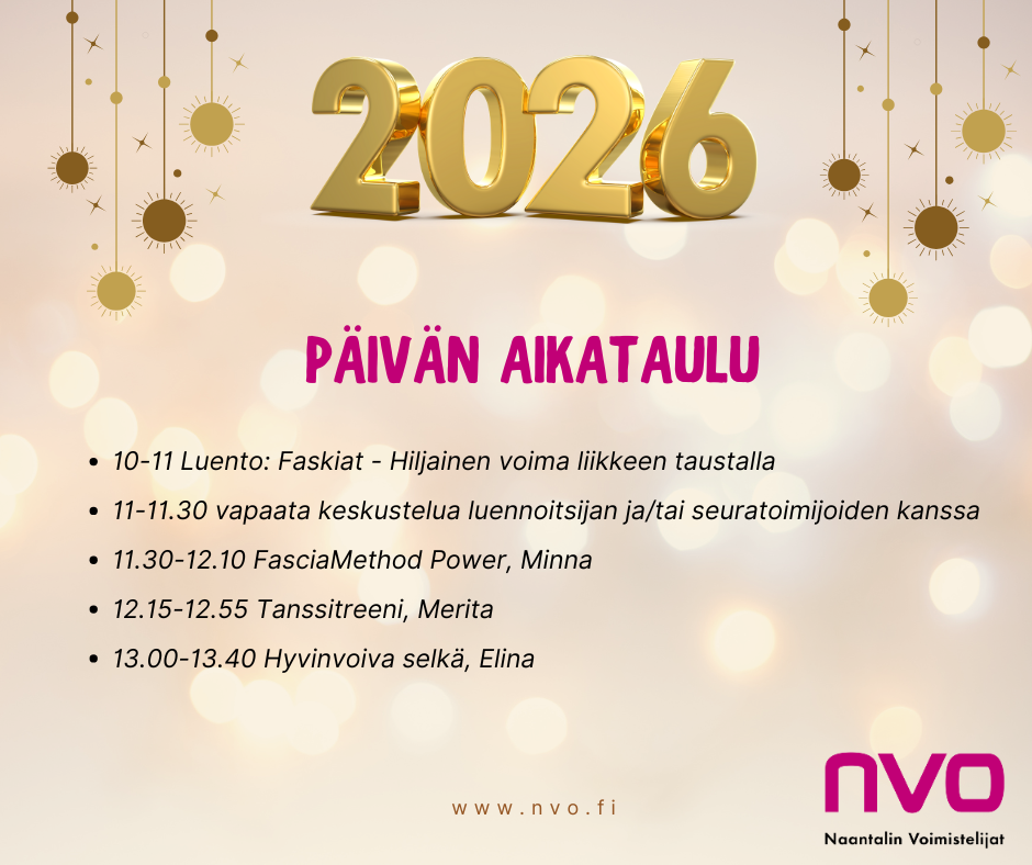 Naantalin Voimistelijoiden maksuton hyvinvointipäivä tarjoaa mielenkiintoista tietoa faskioista, energisoivia tunteja ja hyvää fiilistä koko aamupäivän ajan.
