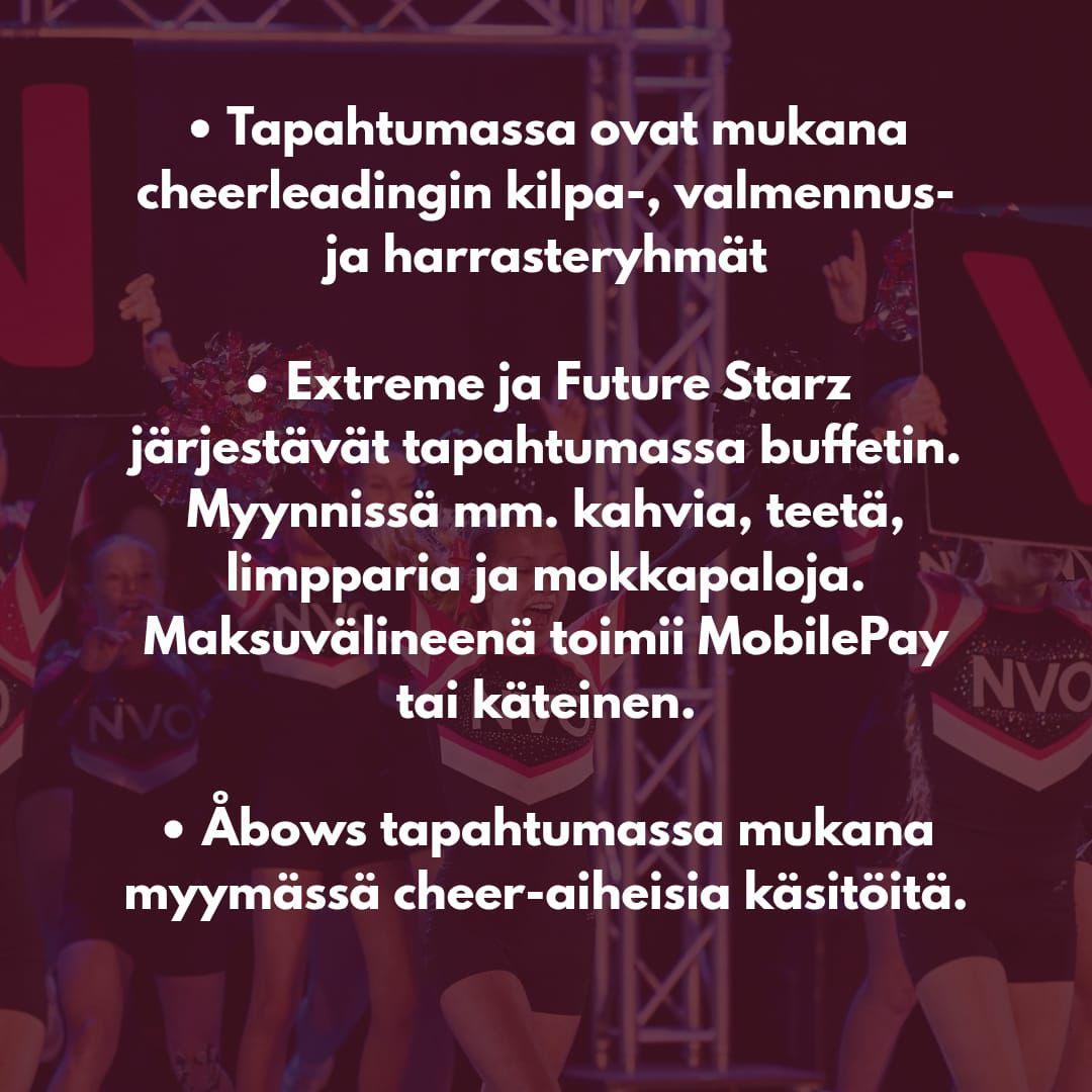 - @nvo.extreme.starz ja @nvo.future.starz järjestävät buffetin, jossa myydään mm. kahvia/ teetä, limpparia, mokkapaloja jne.
